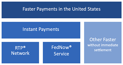 The term that came first and is often used globally is faster payments. It also has the broadest definition, meaning that instant and real-time could be in the faster bucket, but not all faster payments are instant. A faster payment system could be operated by a central bank, a private sector operator, or a combination. For example, the United Kingdom's formal name of its network is the Faster Payment System, which can be described as real-time by some, but funds may or may not settle instantly. Here in the United States, the Fed uses instant payments as a generic term that encompasses the central bank service, FedNow