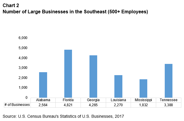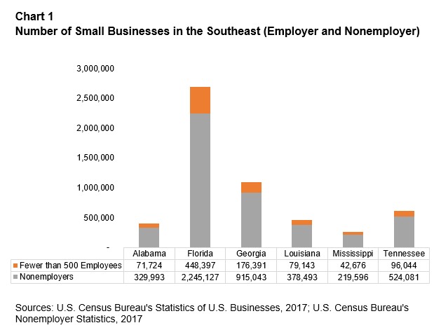 Small businesses (firms with fewer than 500 employees) serve as the lifeblood of the economy. They help drive innovation and competitiveness, accounting for 44 percent of U.S. economic activity.1 The Federal Reserve Bank of Atlanta's Sixth District2 is home to over 5.5 million small businesses, which employ 43.8 percent of all workers in the Southeast and represent 97.9 percent of all employer firms (see charts 1 and 2). In some parts of the region, small businesses play an even larger role in the local economy; for example, small business is responsible for over 50 percent of all jobs in Louisiana (see chart 3). While small business ownership has challenges—only 45 percent of businesses have a five-year survival rate—small businesses allow people to create their own jobs, sometimes when the traditional labor market fails them, and provide employment opportunities to others in their community.3