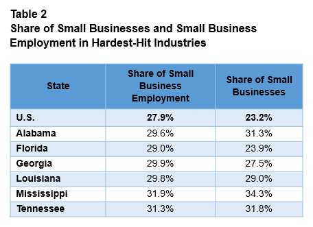 Based on this analysis, table 2 demonstrates that over one in four small businesses within southeastern states are in the hardest-hit industries, with the exception of Florida (24 percent), and the greatest representation in Mississippi (34 percent). Additionally, these small businesses in hardest-hit industries account for almost one-third of employment across the Southeast. Business shutdown orders had a broader reach beyond the hardest-hit industries. Moreover, small businesses outside mandated shutdown lists may have chosen to close voluntarily in response to COVID-19. The actual magnitude of affected small businesses, therefore, is likely greater than our estimates of the hardest-hit industries.