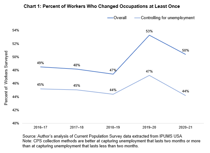 The author used Current Population Survey (CPS) microdata to determine whether worker discontent is resulting in an increased rate of occupational change and to find which occupations workers are leaving. An occupational change is not simply a job change—it is a change to a new line of work. The data also indicate that workers are reevaluating their participation in the labor market. At the outset of the pandemic, 53 percent of workers surveyed had more than once changed occupations from 2019 to 2020 (chart 1), a 6-percentage point increase from the previous year. Before the pandemic, the trend was virtually flat. The percentage returned to the prepandemic levels in the following survey period, 2020–21, but only when controlling for unemployment (chart 1). In fact, workers’ interactions with unemployment remain at postpandemic highs. The findings in chart 1 suggest that workers are not currently switching occupations at an outsized rate (within a one-year period) but are taking longer to reexamine their interaction with or place in the labor market.
