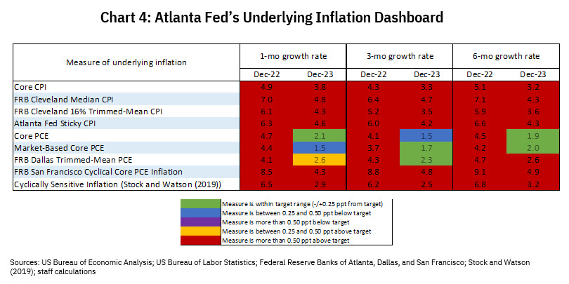 Finally, note all the red in this picture (chart 4). This is our Underlying Inflation Dashboard. Red means, basically, well above target, and as of December, two-thirds of the metrics that comprise the dashboard are still in the red.
