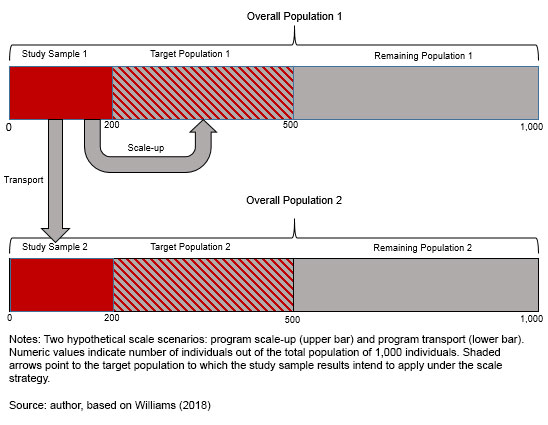 The lower panel of the chart represents the second form of program scale-up: program transport to another target population. The grey arrow pointing straight downwards indicates that the goal is to apply the results from Study Sample 1, which was conducted with a sample from another target population, to a sample from a different target population. Policymakers then intend to generalize the results from Study Sample 2 to the larger population in Target Population 2.