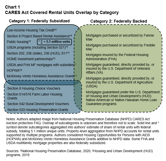 The CARES Act's federally subsidized affordable housing category includes properties that are federally owned, receive federal funding, or were constructed or purchased using federal financing or active incentive programs designed to create affordable housing. The act draws its list of covered federal programs from the Violence against Women Act (34 U.S.C. 12491(a)(3)) and adds the rural housing voucher program (42 U.S.C. 1490r) to that list. Chart 1 represents federally subsidized rental housing in blue and breaks it down into boxes representing programs included in this category.