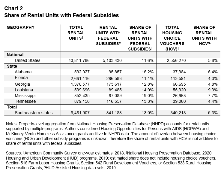 - 9 Authors' calculation of rental units with federal subsidies. The number of units with federal subsidies are based on data aggregated from 2020 NHPD data and 2019 HOPWA data (state-based data, and national totals). The number of total rental units is based on 2018 Census American Community Survey one-year estimates. The following properties are included in the NHPD database: Low Income Housing Tax Credit (LIHTC), Section 8 Project Based Rental Assistance, Public Housing, USDA (Sections 414, 515, 521, and 538), Section 202 Direct Loans, Section 236, HUD Insured Mortgages, HOME Investments Partnership Program, and State Subsidies.