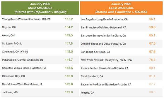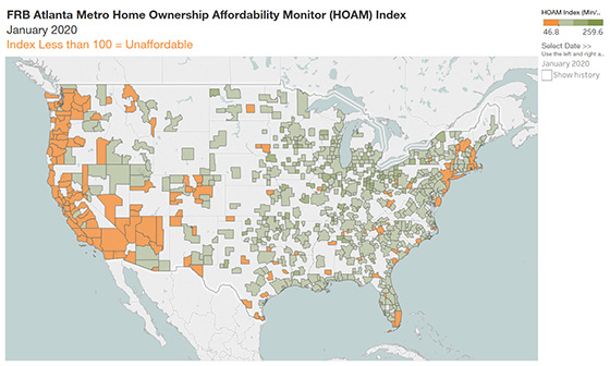 Home affordability varies significantly by metropolitan area. In January 2020, around 20 percent of metro areas had a HOAM index below 100, indicating that those regions were unaffordable to median-income households. High-cost metro areas on the West Coast and in the Northeast as well as South Florida were among the least affordable, while metros in the middle of the country, particularly in the Midwest, tended to be the most affordable.