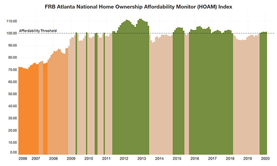 Prior to the COVID-19 crisis, home ownership was becoming more affordable in the United States as interest rates declined and household incomes improved, according to the Federal Reserve Bank of Atlanta’s Home Ownership Affordability Monitor (HOAM) index. Still, at the start of the new year and prior to the important spring selling season, the U.S. housing market was only marginally affordable for the median-income household. In January 2020, home ownership costs (as measured by principal and interest, taxes, and insurance) accounted for 29.6 percent of the annual median income of U.S. households, which was only slightly below the 30 percent affordability threshold set by HUD.