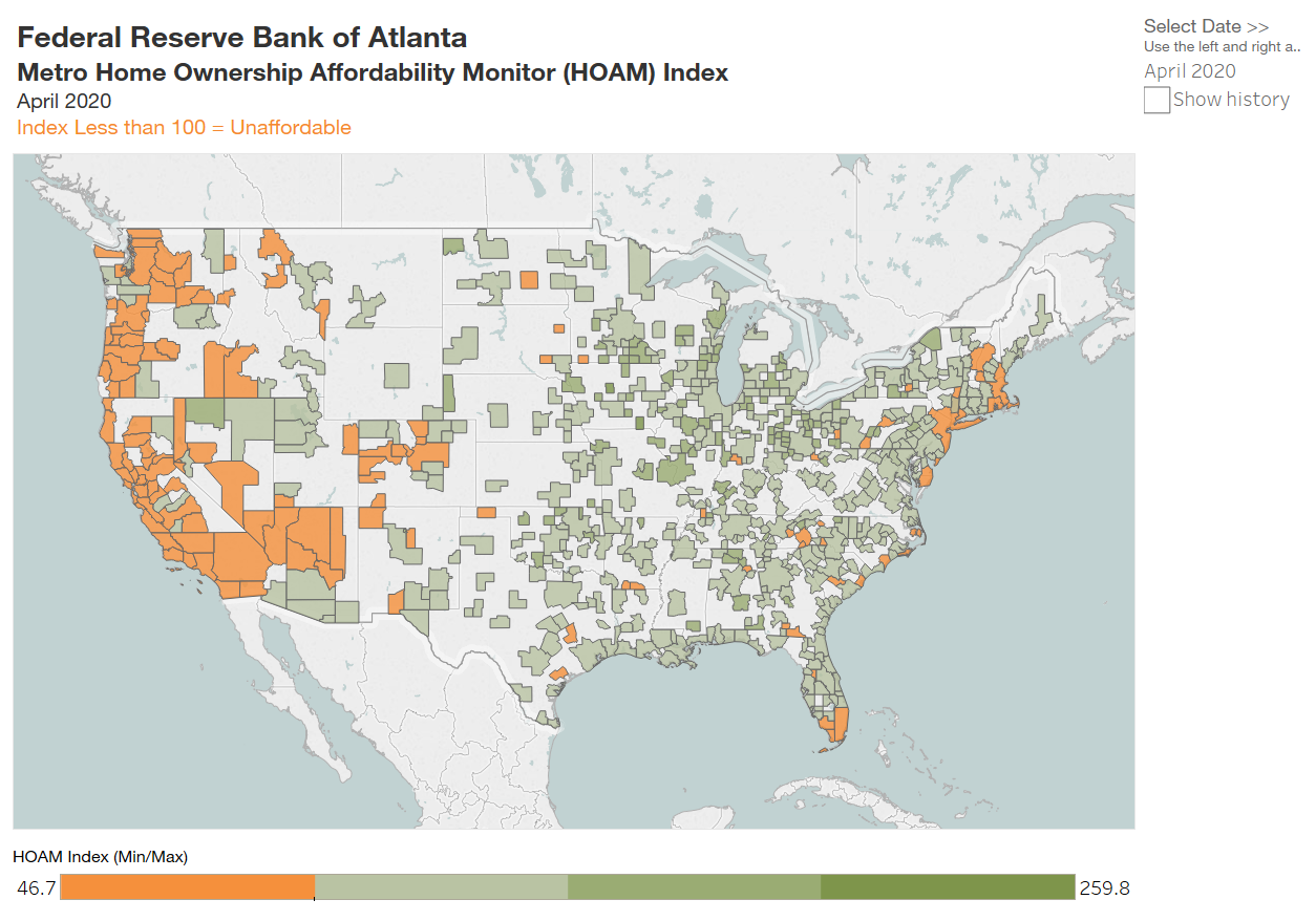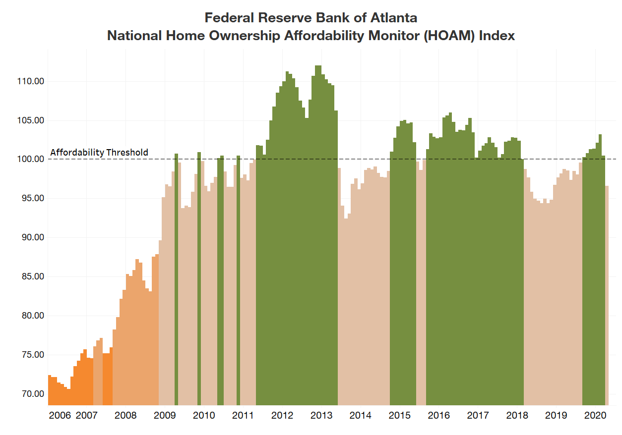 Home ownership affordability declined in April as the median existing home sales price in the United States reached a record high, according to the Federal Reserve Bank of Atlanta’s Home Ownership Affordability Monitor (HOAM) index. In April, the HOAM index declined to 96.61 from 100.46 in March and 98.55 from April 2019. (Note: A HOAM index below 100 indicates that the median-priced home is unaffordable to the median-income household given the current interest rate.) Home ownership costs (as measured by principal and interest, taxes, and insurance) accounted for 31.1 percent of the annual median income of U.S. households, above the 30 percent affordability threshold set by HUD. April was the first time since August of last year that the national HOAM index dropped below the affordability threshold.