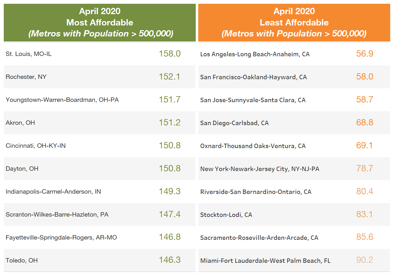 Metro areas that showed the greatest improvement in homeownership affordability over the past year tended to have flat or declining growth in home prices and/or stronger increases in incomes. Both St. Louis and Rochester, the most affordable and least expensive large markets in April, respectively, top the list in terms of greatest improvement in affordability. In St. Louis, affordability increased by 16.5 percent, and Rochester had a 13.1 percent gain. However, the improvement in affordability in both areas was primarily attributed to sharp declines in home prices. Meanwhile, Charleston, South Carolina, had the sharpest falloff in home ownership affordability from April 2019 to April 2020, down by 8.4 percent. Bucking the trend in St. Louis and Rochester, home prices in Charleston increased sharply over the past year, rising 21.1 percent. As of April, the median home price in Charleston reached a record high of $306,188, up from $253,883 a year ago.