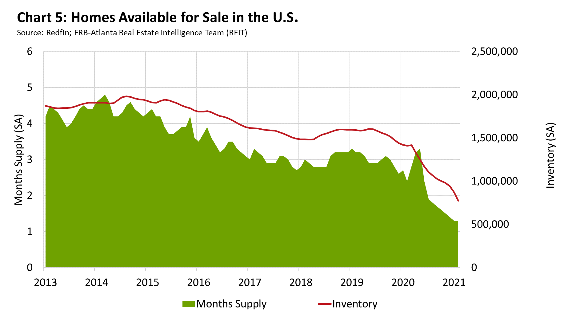 The current housing cycle has been marked by a seemingly inexorable decline in inventory, and early 2021 data suggest this trend is continuing. In the year that ended in January 2021, the supply of homes for sale was cut nearly in half, according to Redfin, a national real estate brokerage. Subsequently, the supply of available homes plummeted to just 1.3 months, showing that demand greatly exceeds supply (see chart 5). Generally, a four- to six-month supply of inventory is considered balanced.