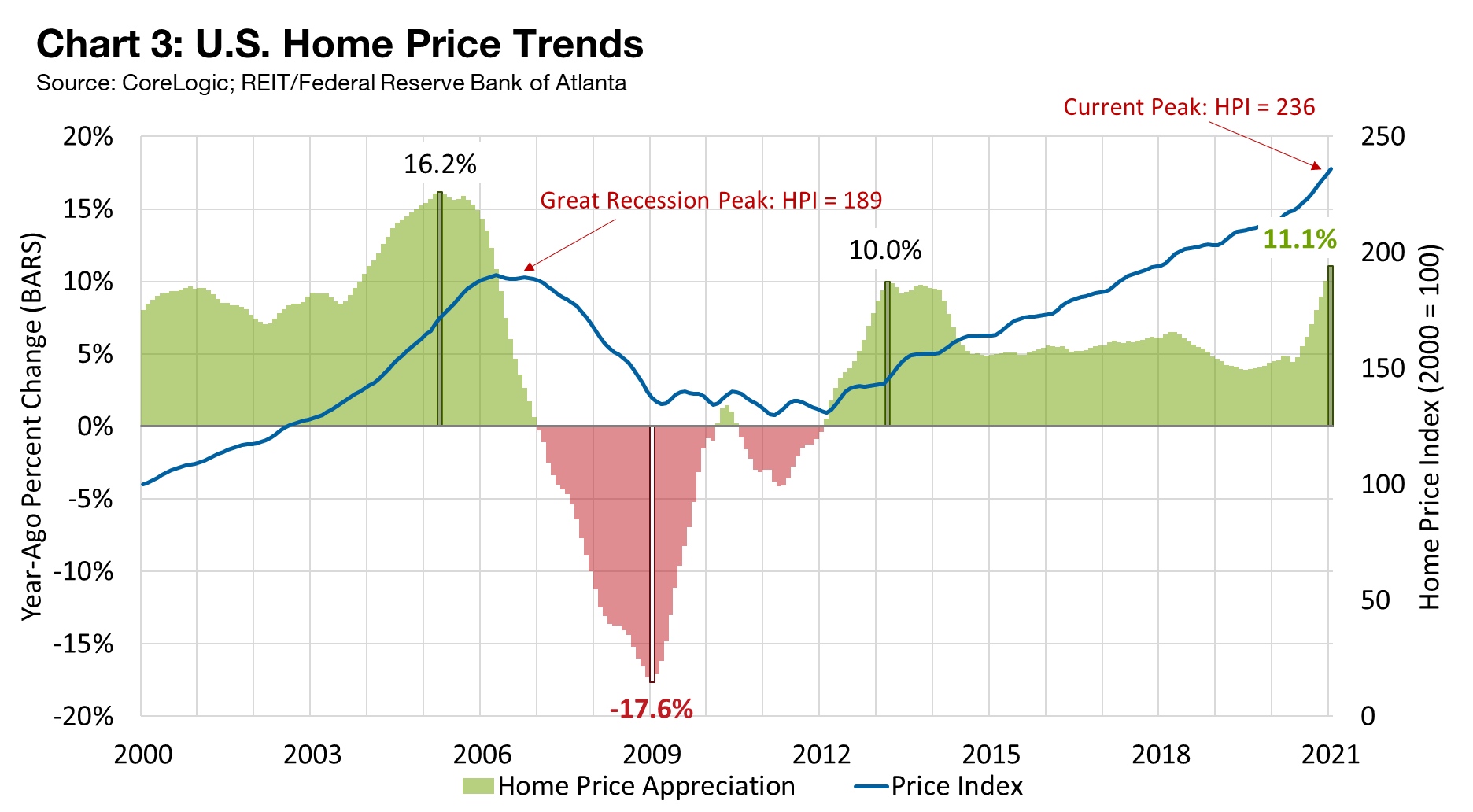 In January, home prices rose 11.1 percent year over year (see chart 3). This level marked the highest growth since 2005, when prices jumped 16.2 percent. Home values are now 24.7 percent higher than their peak before the Great Recession.