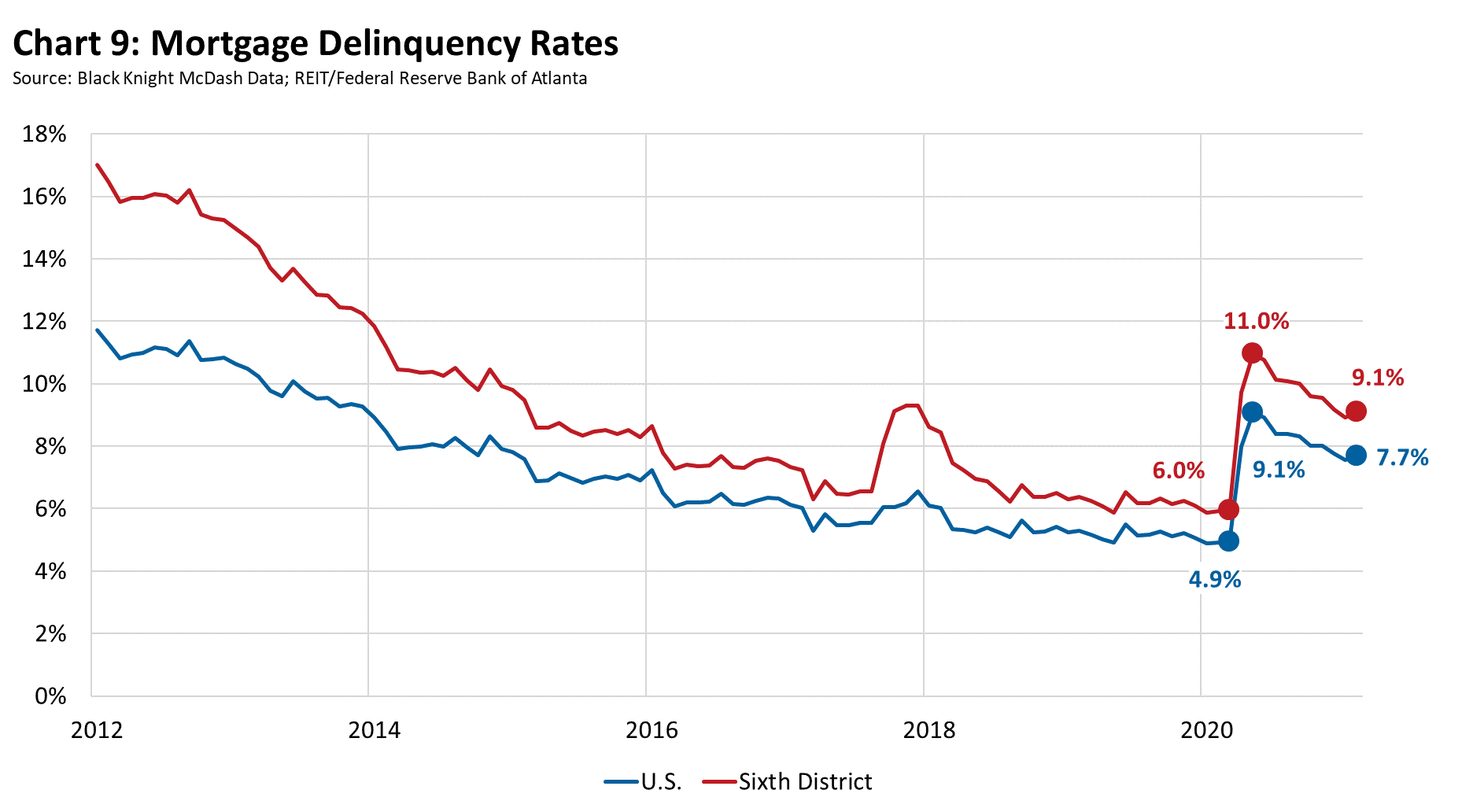 At the onset of the pandemic, national mortgage delinquencies jumped to 8 percent in April 2020 from 4.9 percent the previous month. Though the number of people behind in their payments drifted down for the remainder of 2020, delinquencies rose at the beginning of 2021 and remain well above pre-pandemic levels at 7.7 percent (see chart 9). For now, federal forbearance guidelines have helped stave off a rise in foreclosures. Still, the Consumer Financial Protection Bureau (CFPB) recently warned mortgage servicers to dedicate sufficient resources and staff to prepare for a surge in borrowers who will need help when federal emergency mortgage protections expire this summer and fall. The CFPB is seeking comment on a proposal that would generally prohibit servicers from starting foreclosure proceedings until after December 31, 2021.