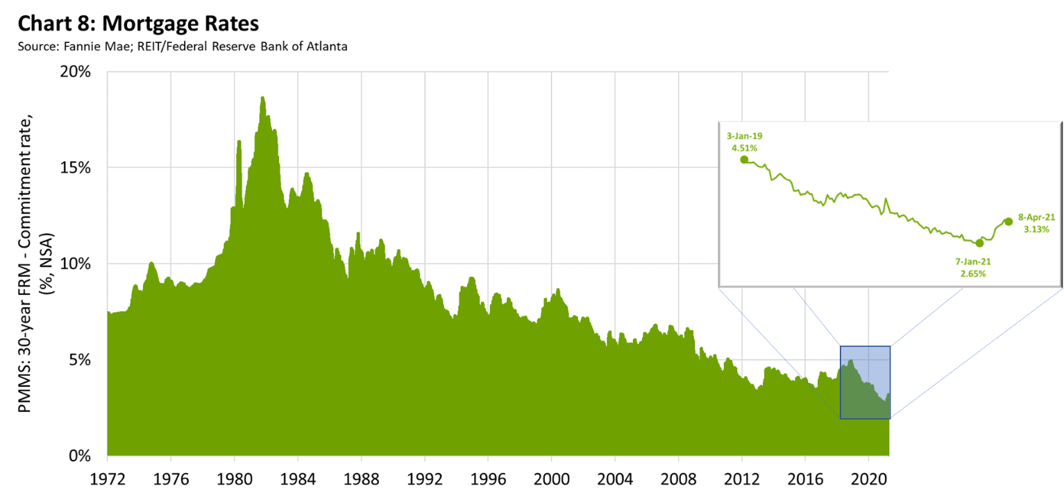 In early April, 30-year fixed-mortgage rates were up 48 basis points from a historic low in early January, according to data from Fannie Mae. Rates have been above 3 percent since early March (see chart 8). Though rates are still low by historical standards, the recent slight increase and sharply rising home prices are beginning to take a toll on housing activity. According to the Mortgage Bankers Association, the rise in rates has cooled mortgage applications for purchases and refinancing. Higher rates have also contributed to a modest net share of banks reporting that they expect weaker demand for government-sponsored enterprise–eligible residential mortgages, according to a Federal Reserve survey of senior loan officers from January 2021.