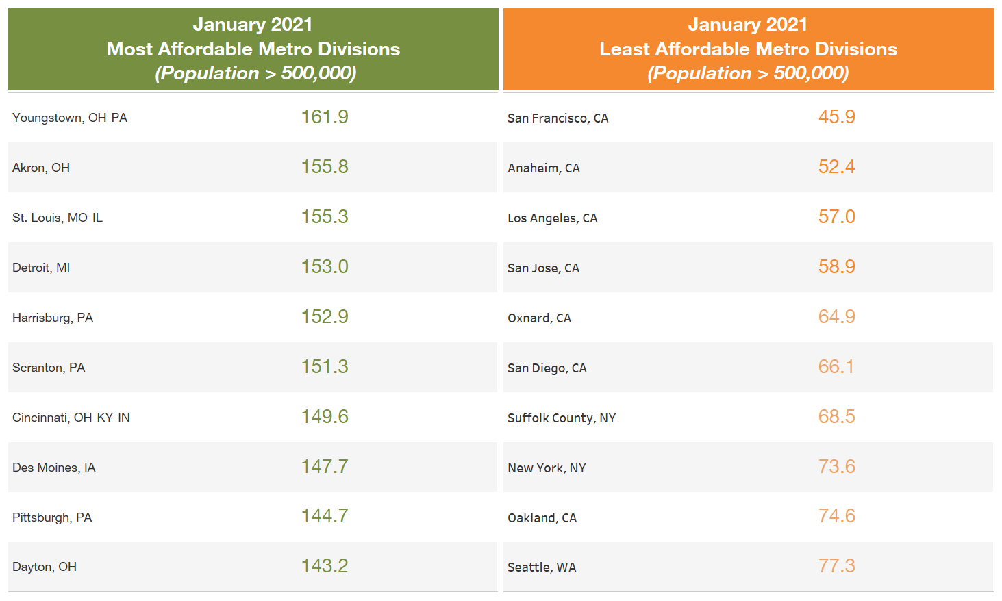 Overall, 22 percent of metro areas tracked by HOAM were unaffordable in January 2021. Even so, 40 percent of HOAM markets had a deterioration in affordability over the past year as home prices went up. Of these, Milwaukee, Wisconsin; Bridgeport, Connecticut; and Spokane, Washington, saw the sharpest declines in affordability as rising prices offset the benefit from low interest rates. Markets with more moderate home price growth such as St. Louis, Missouri; Harrisburg, Pennsylvania; and Youngstown, Ohio, had the strongest improvement in affordability.