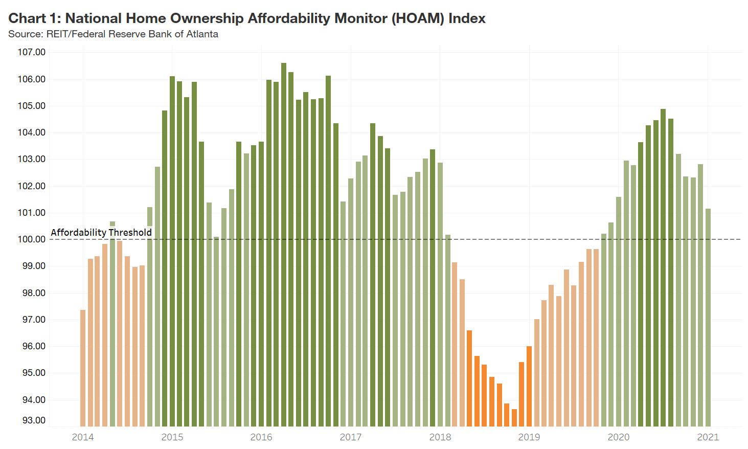 Robust home price appreciation, the economic challenges of the lockdown, and recent increases in mortgage rates have eroded home affordability nationally. Heading into 2020, affordability was increasing even in the face of rising home prices as buyers benefited from historically low interest rates and steady income growth. Lockdowns stalled sales in April and May, but sales roared back as economies began to reopen. In August, the national HOAM index reached its highest point of 104.89. In September, however, affordability began to retreat as rising home prices overtook the positive effects of low rates and income growth. As of January 2021, housing remained affordable overall, with an index of 101.1 (see chart 1). However, it appears a turning point occurred when mortgage rates hit a historic low in early January before beginning to creep upward. With prices and interest rates continuing to rise into the second quarter of 2021, affordability is expected to keep declining, and median-income households will find it more and more difficult to purchase a home.