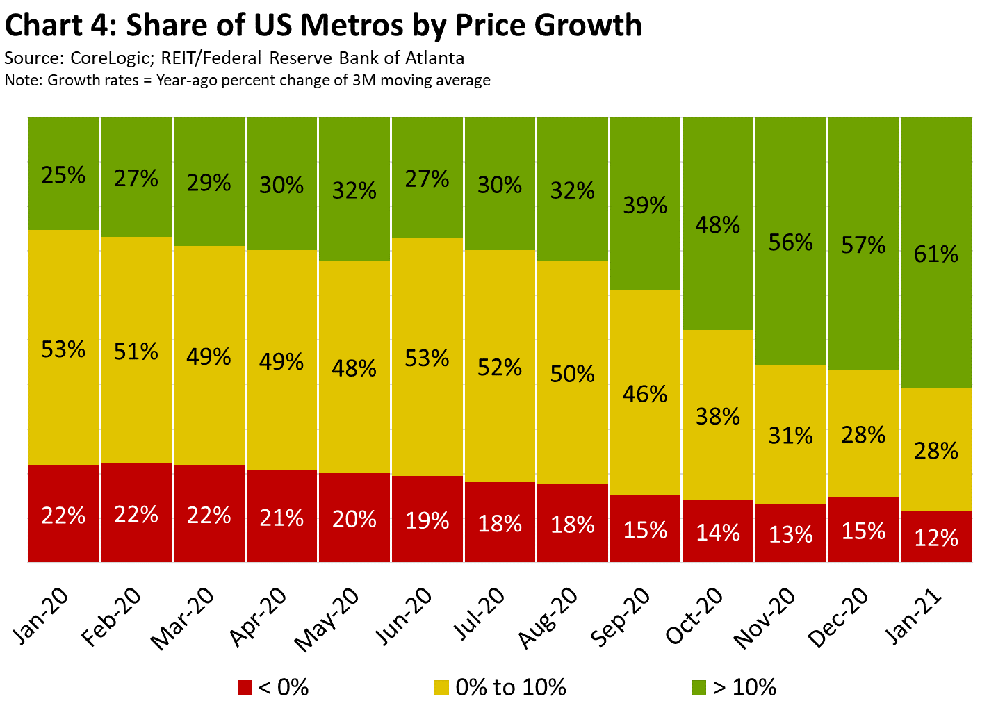 What's more, the share of U.S. metro areas with double-digit percentage gains in home prices surged from 25 percent in January 2020 to 61 percent in January of this year (see chart 4).
