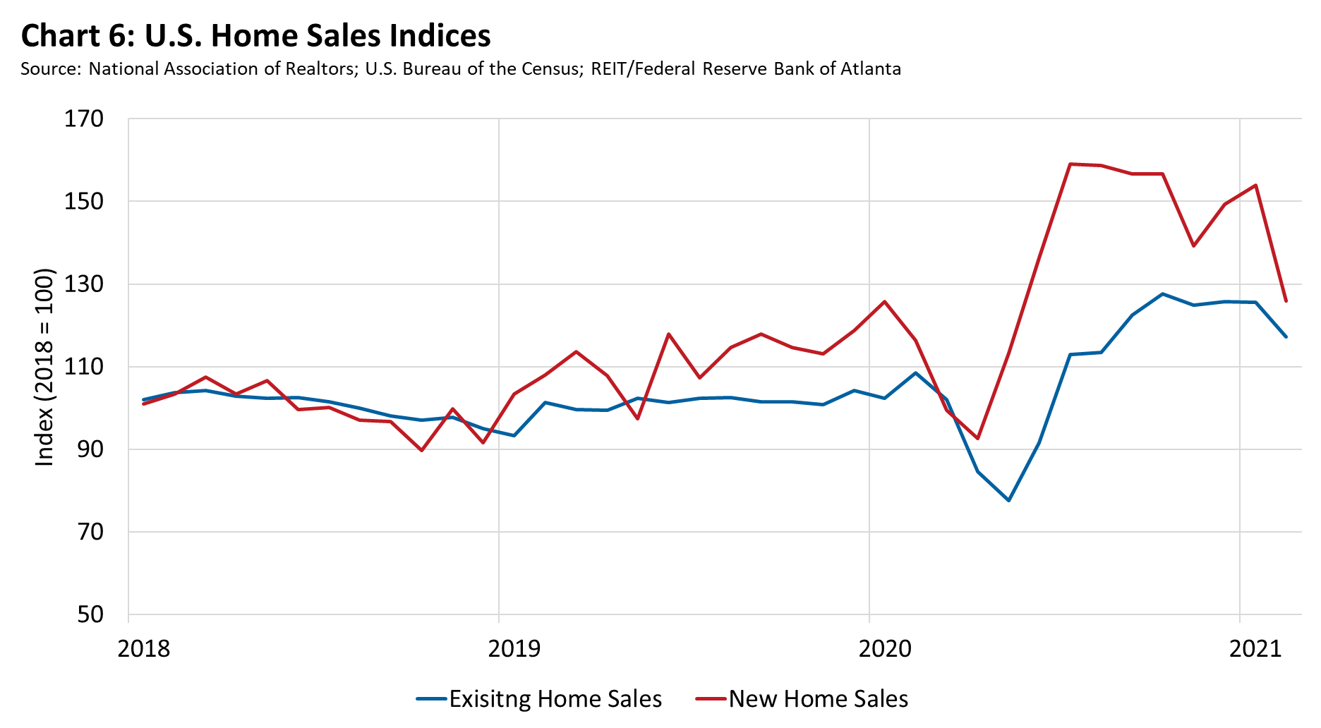 After falling early in the pandemic, home sales increased sharply starting midyear of 2020. By February 2021, however, both new and existing home sales fell from the prior month (see chart 6). Over the three months that ended in February 2021, home sales fell year over year in 47 percent of metro areas, while 35 percent of metros had double-digit percentage increases. The sales decrease mostly correlates with a rise in interest rates, limited supply, and the subsequent decline in affordability.