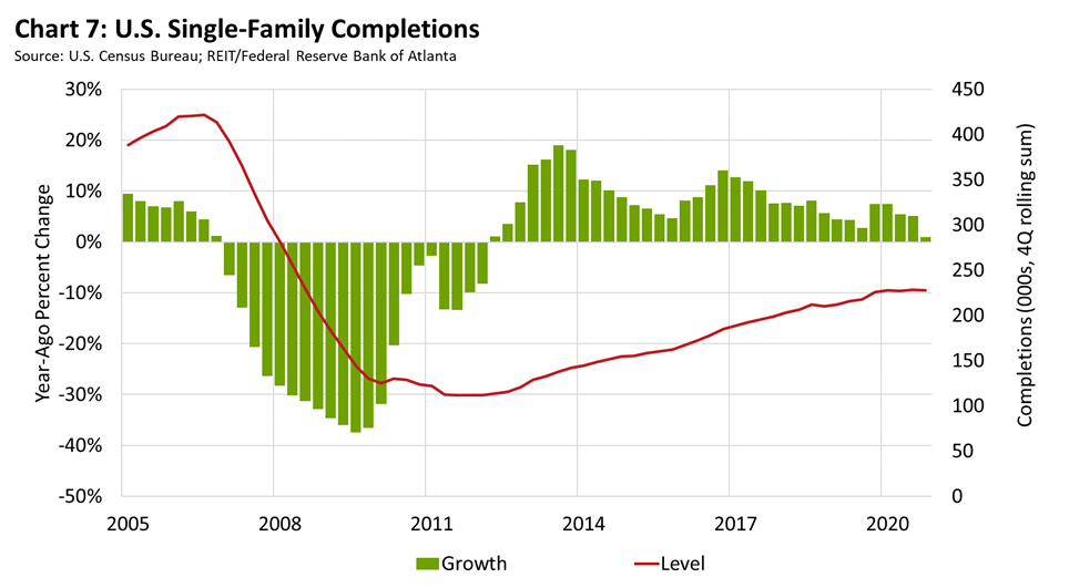 Construction activity leveled off last year, likely because of the material and labor constraints tied to homebuilding during the pandemic. By the fourth quarter of 2020, construction was nearly flat on a year-ago basis, despite rising demand for new housing (see chart 7). Data from real estate consultant Zonda Intelligence showed that Texas continued to dominate homebuilding nationally. It includes four of the top 10 markets (Dallas-Fort Worth, Houston, Austin, and San Antonio) for completions. Atlanta; Phoenix; Washington, DC; Charlotte, North Carolina; and the Florida cities of Orlando and Tampa rounded out the top 10 new construction markets.