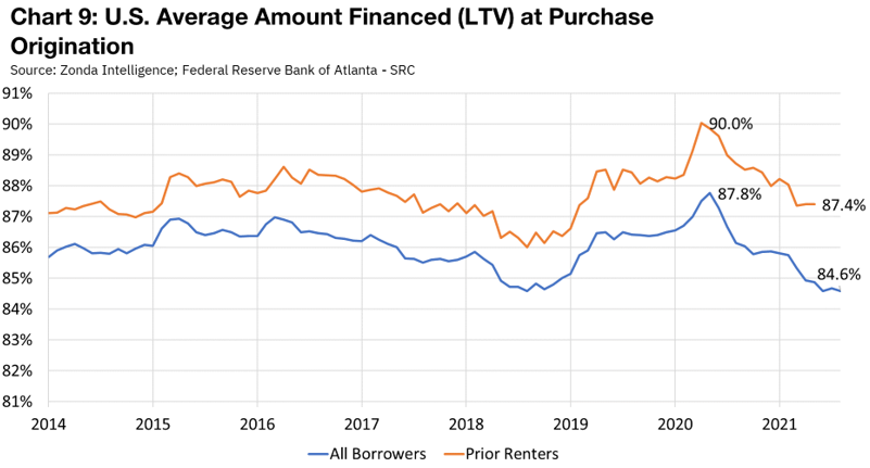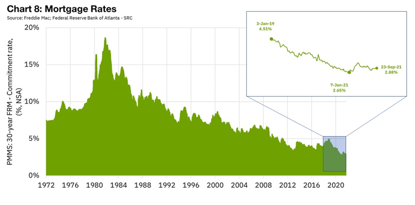 - Mortgage Rates and Underwriting: According to Freddie Mac, 30-year fixed mortgage rates stood at 2.88 percent on September 21, up from 2.65 percent in early January but still near historic lows (see chart 8). Even so, Fannie Mae’s Home Purchase Sentiment Index (HPSI) declined 3.9 percent in July as buyers expressed increased concern about higher home prices and the lack of properties for sale. In terms of underwriting, the recent Federal Reserve survey of senior loan officers found that, as a whole, banks reported easing standards on most mortgage types. Continued easing was noted on single family jumbo mortgages (those exceeding government-sponsored enterprise, or GSE, loan-servicing limits of $548,250 in all states except for areas designated as high-cost markets, where the limit is $822,375). The easing mostly reflects the removal of tighter lending policies put in place during the pandemic to bolster protections against default.