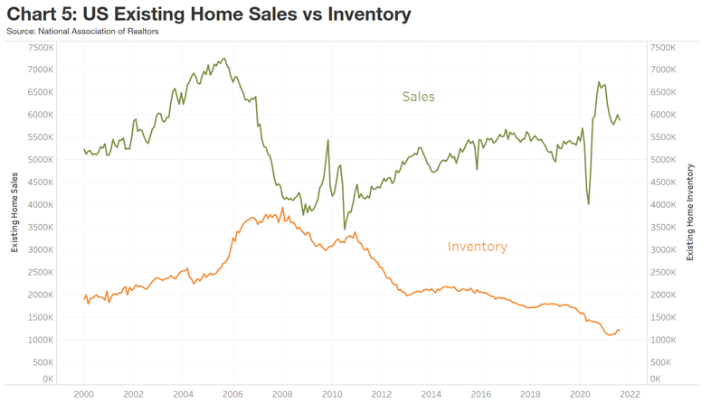 - Home Sales and Inventory: Demand for housing, while still strong by historic standards, is showing signs of easing, as existing home sales modestly dropped in August (down 2 percent) for the first time since April of last year, according to data from the National Association of Realtors. The more moderate level of housing demand may in part be due to concerns about affordability and buyer fatigue. At the same time, inventory levels look to be improving. Though inventories are still down by 14.7 percent from a year earlier, the rate of decline is moderating, an indication that supply and demand levels are becoming more aligned (see chart 5). Still, inventory remains low at a supply of 2.6 months and prices are expected to remain under steady upward pressure in the near future.