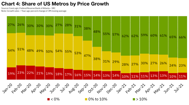 - Home Price Appreciation: Although home prices continue to rise, the rate of increase is lessening from the peak levels earlier this year (see chart 3). In July, home prices jumped 17.6 percent, down from May’s 23.6 percent rise. At the same time, the share of metro areas that have seen double-digit percentage rates of appreciation remain high at 66 percent (see chart 4).