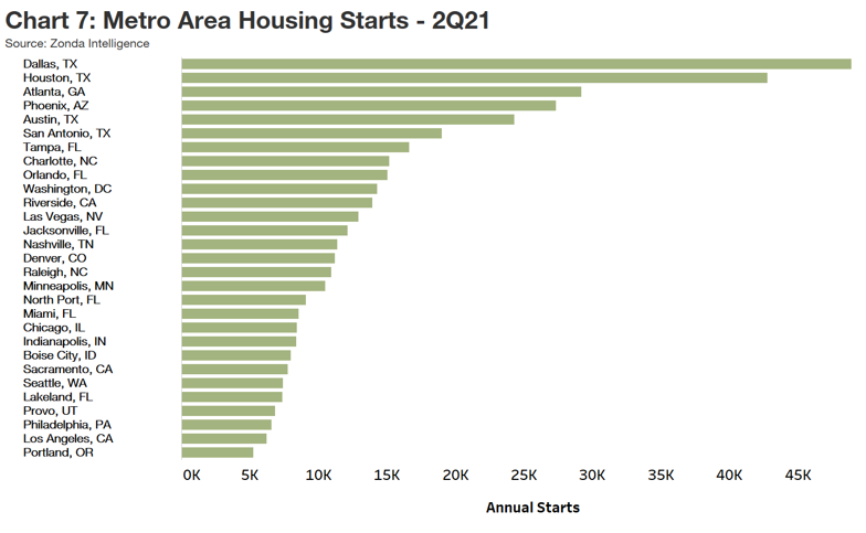 - Construction Activity: Impaired by capacity constraints through most of the pandemic, home construction has not kept pace with demand. Home builders continue to contend with rising costs and supply chain disruptions. Although the price of lumber has dropped from record highs earlier this year, costs for labor, land, and other materials continue to increase. After some builders slowed the pace of sales contracts earlier this year to better manage costs, many are now moving to resume more normal sales activity. Recently, builders have begun to accelerate the rate of new home starts, which rose by 23.1 percent in the second quarter from last year (see chart 6). Markets in Texas (such as Dallas and Houston) continue to lead the nation in new home construction activity (see chart 7). During the pandemic, low interest rates helped offset increases in new home prices, allowing builders to pass on rising costs to homebuyers. However, with affordability becoming more of a concern, some builders are seeing greater buyer resistance to price increases.