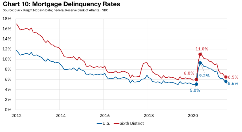 - Mortgage Credit Quality and Delinquencies: Throughout the pandemic, credit quality for new mortgages has remained strong. For example, after spiking in May 2020, the average loan-to-value ratio (LTV) for newly originated purchase mortgages has declined for borrowers who previously owned a home as well as prior renters, according to data provider Zonda Intelligence (see chart 9). As of August, the average LTV ratio for all borrowers dropped to 84.6 percent from a high of 87.8 percent in May 2020. For borrowers who were prior renters, the average LTV fell to 87.4 percent after peaking at 90 percent in May 2020. Lower LTV ratios partly reflect the large share of borrowers who have cash to contribute toward purchasing a home. They could also point to the absence of entry-level buyers with less purchasing power who have been priced out of the markets. Meanwhile, mortgage delinquencies continued to fall to pre-pandemic levels as more borrowers returned to remitting payments (see chart 10). Of all borrowers who were in forbearance during the pandemic, 46 percent have resumed making payments, while 21 percent have paid off their mortgages, according to data provided by Black Knight. Still, it is estimated that 1.6 million borrowers who are currently delinquent are not in a loss-mitigation program. With many forbearance programs and accommodations set to lapse by the end of the year, servicers will have to be prepared to transition borrowers to mortgage restructuring programs or foreclosure.