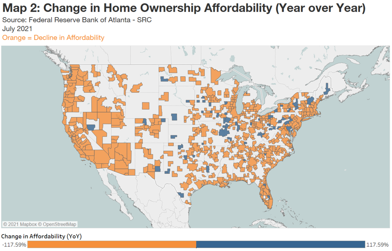 Over 80 percent of metro areas in the country saw a decline in affordability in the past year (see map 2). Among large metros, only St. Louis, Missouri; Harrisburg, Pennsylvania; Baltimore, Maryland; and Youngstown, Ohio, showed improvement in affordability in July from last year. For the most part, home sales price growth in these markets was not enough to offset the benefit from low interest rates and stronger wages.