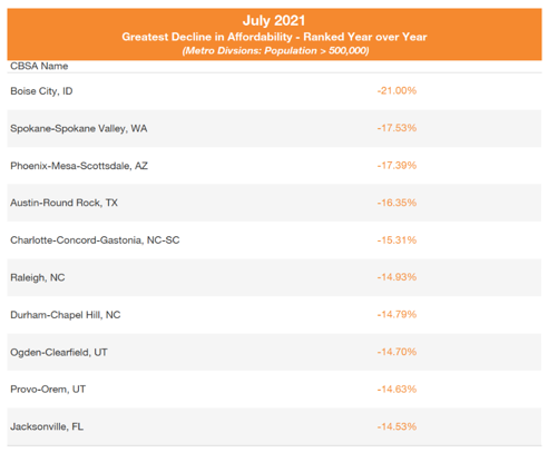 - National home ownership affordability fell 11.1 percent in July, the sharpest decline since 2013.
